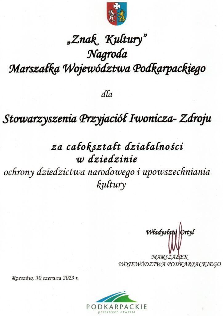 Dziękujemy wnioskodawcy pani Dorocie Sokołowskiej-Świstak Dyrektor Centrum Kultury i Czytelnictwa w Iwoniczu-Zdroju za współpracę i docenienie naszej działalności oraz panu Grzegorz Nieradka Doradca Ministra Kultury i Dziedzictwa Narodowego za życzliwość i wspieranie naszych działań.